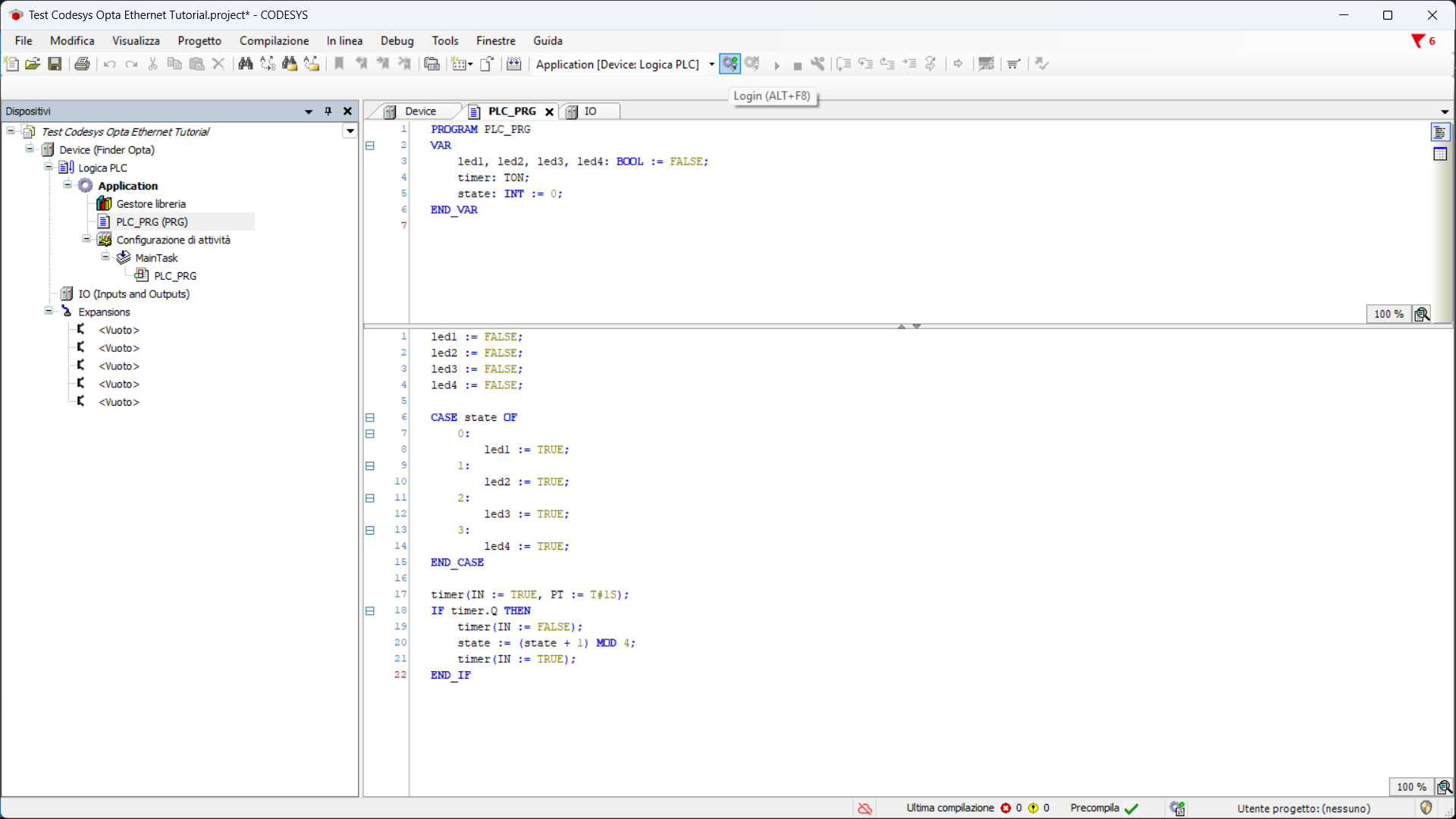 Il programma che utilizziamo in seguito serve semplicemente a capire se la configurazione é stata caricata correttamente. La sua funzione è quella di far accendere a turno i led di Finder OPTA.