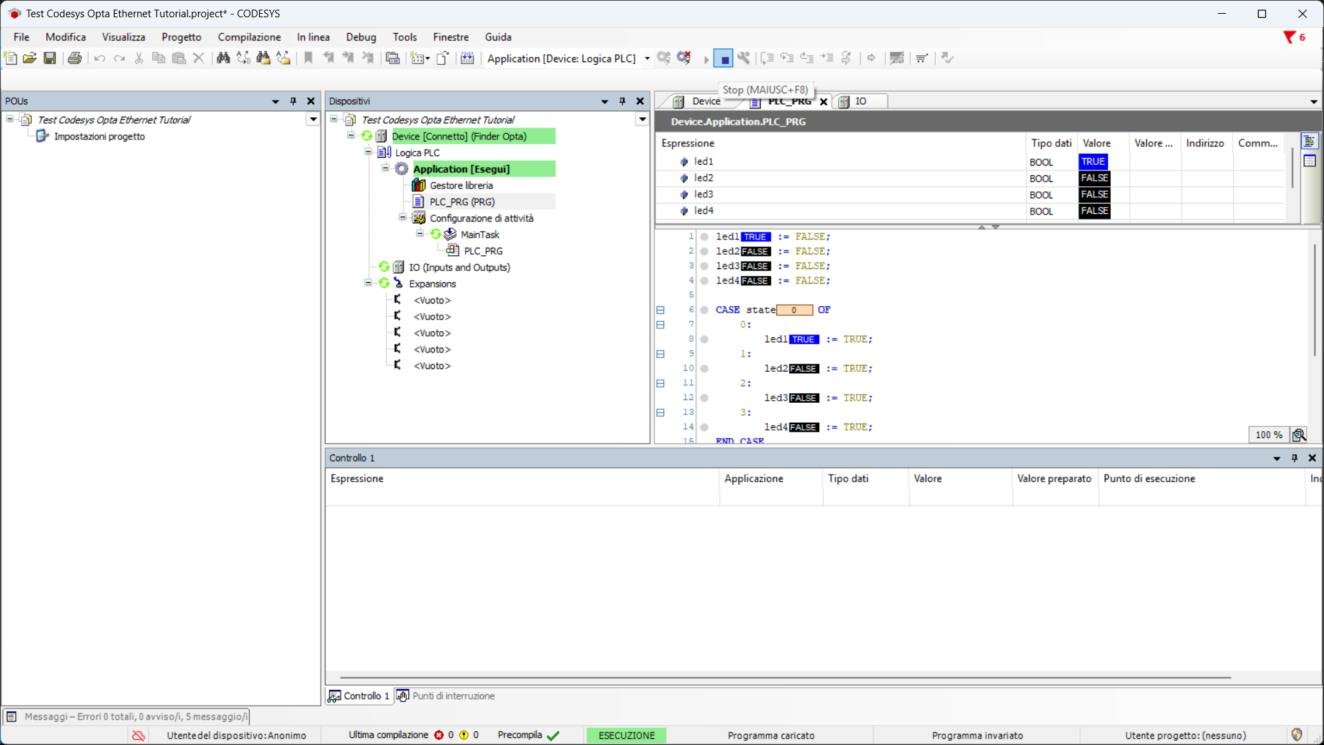 A questo punto il programma partirà e i quattro LED dell'OPTA inizieranno ad accendersi ciclicamente, per fermarlo premere Stop.