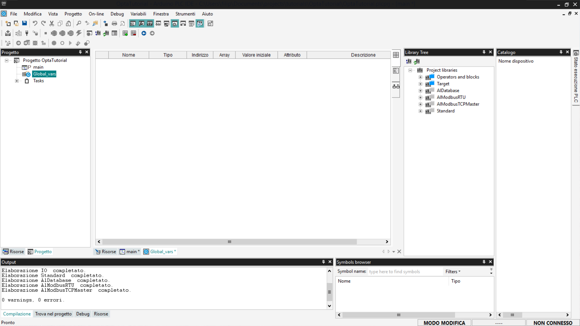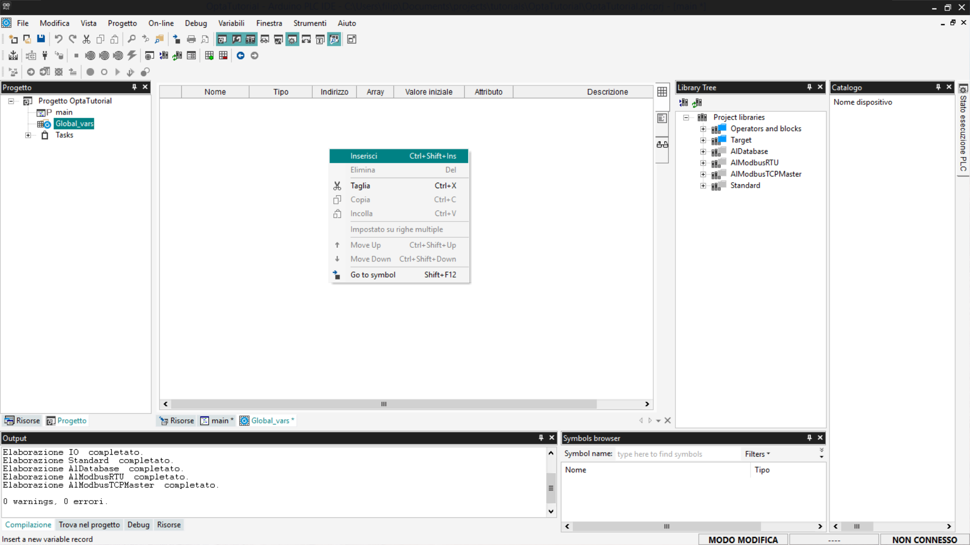 La variabile appena aggiunta verrà visualizzata nella sezione Global_vars e sarà accessibile da tutti i programmi contenuti nel progetto.