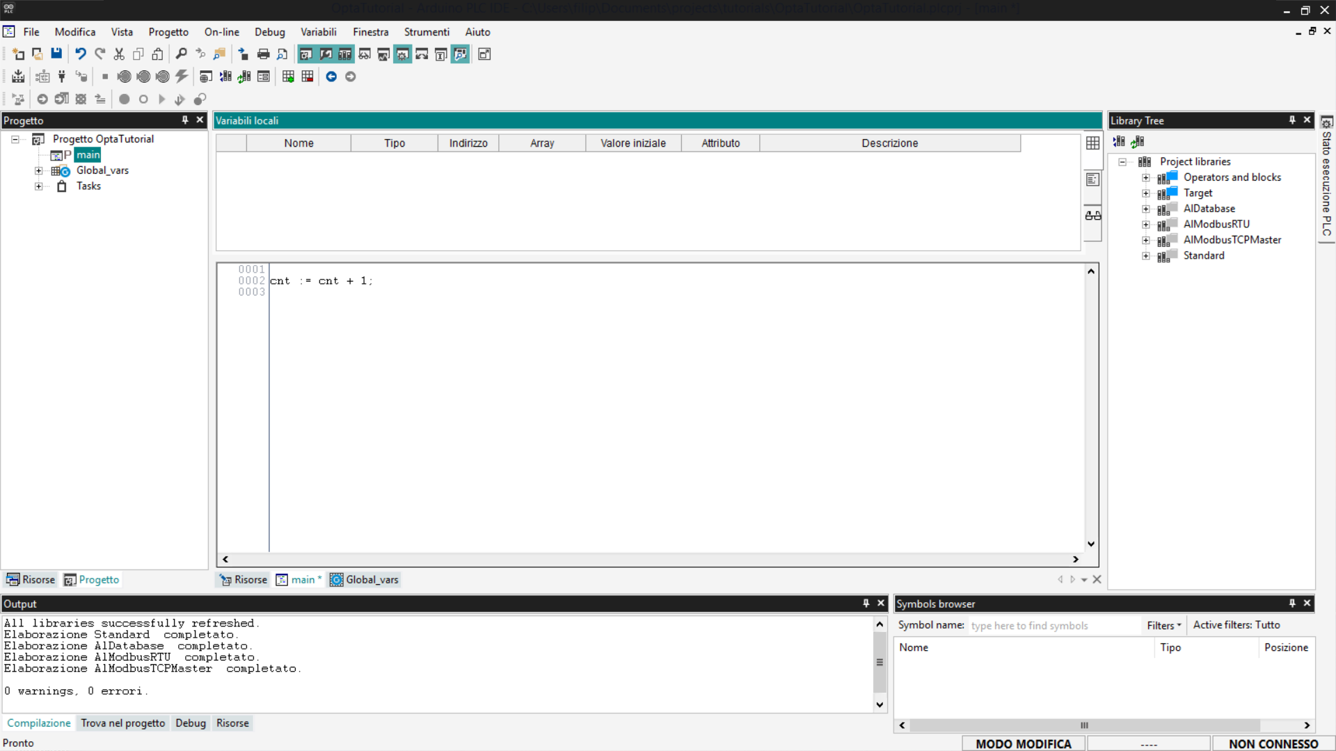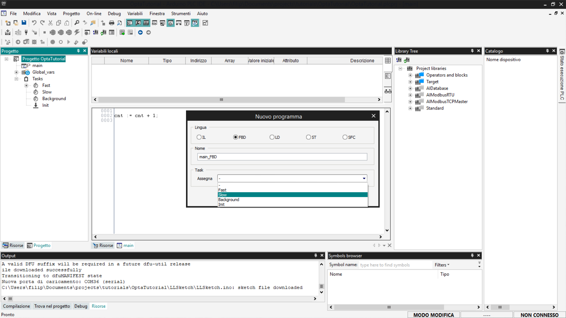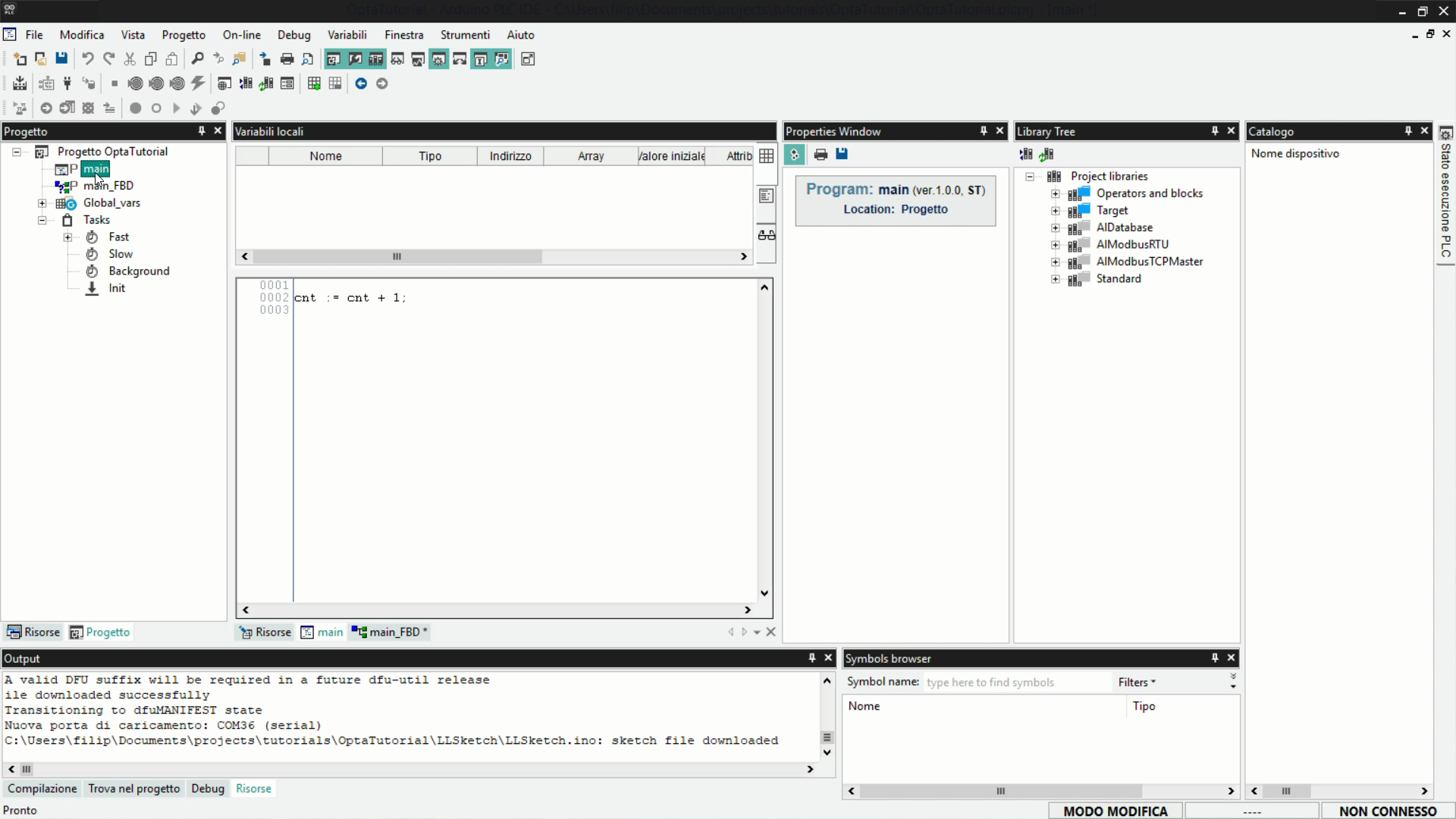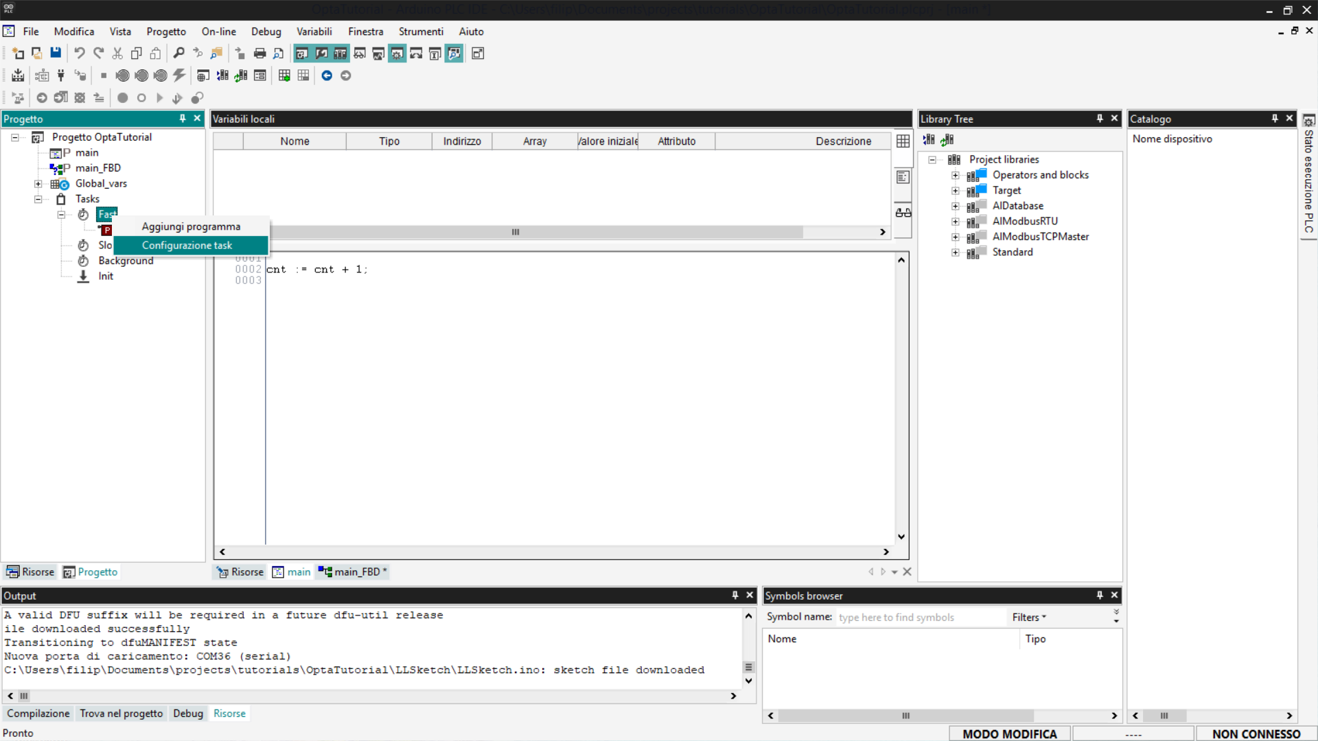 Questo tutorial fornisce una guida passo-passo all'utilizzo di Finder OPTA con Arduino PLC IDE, coprendo la gestione delle variabili e la configurazione dei task.