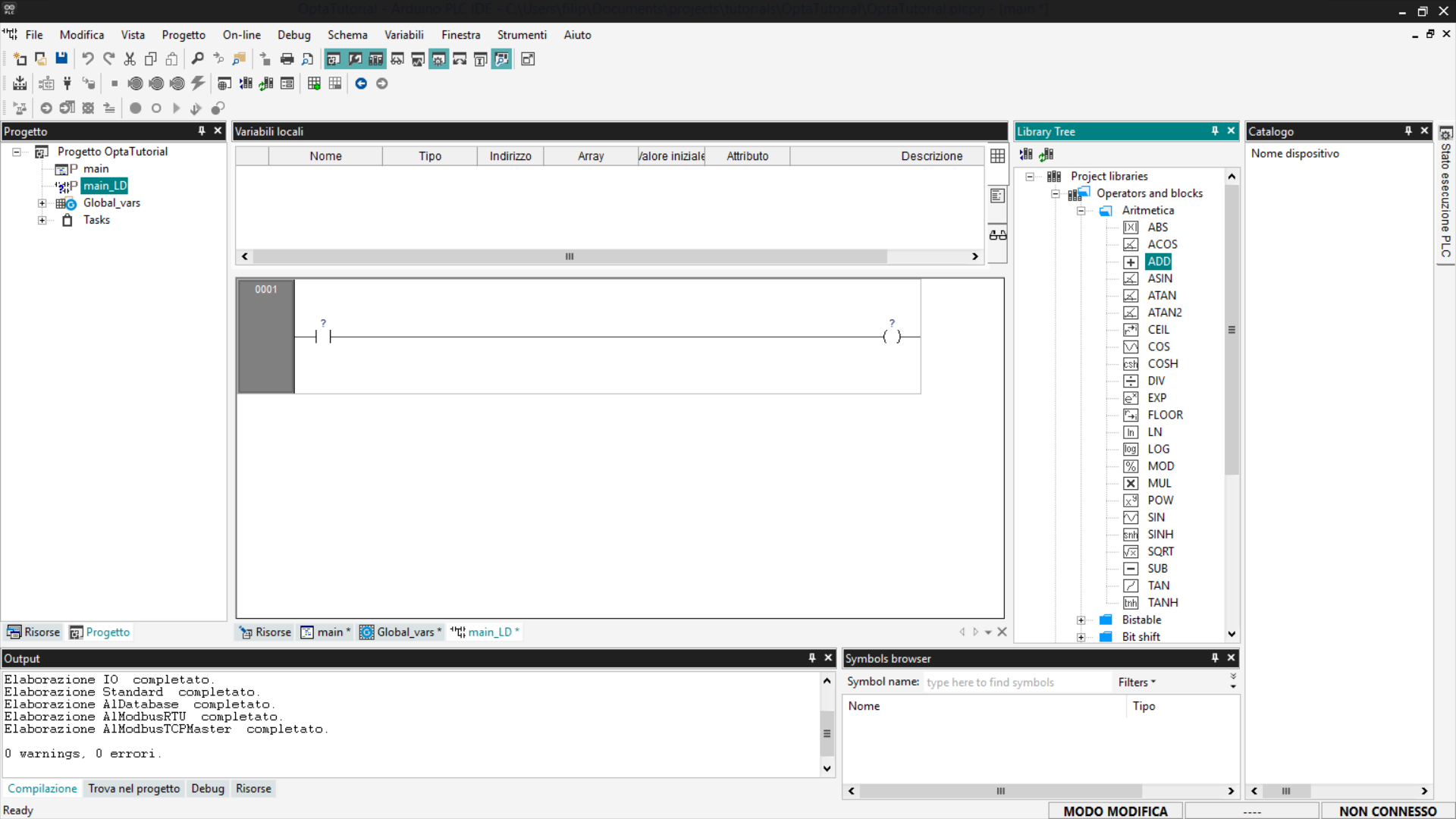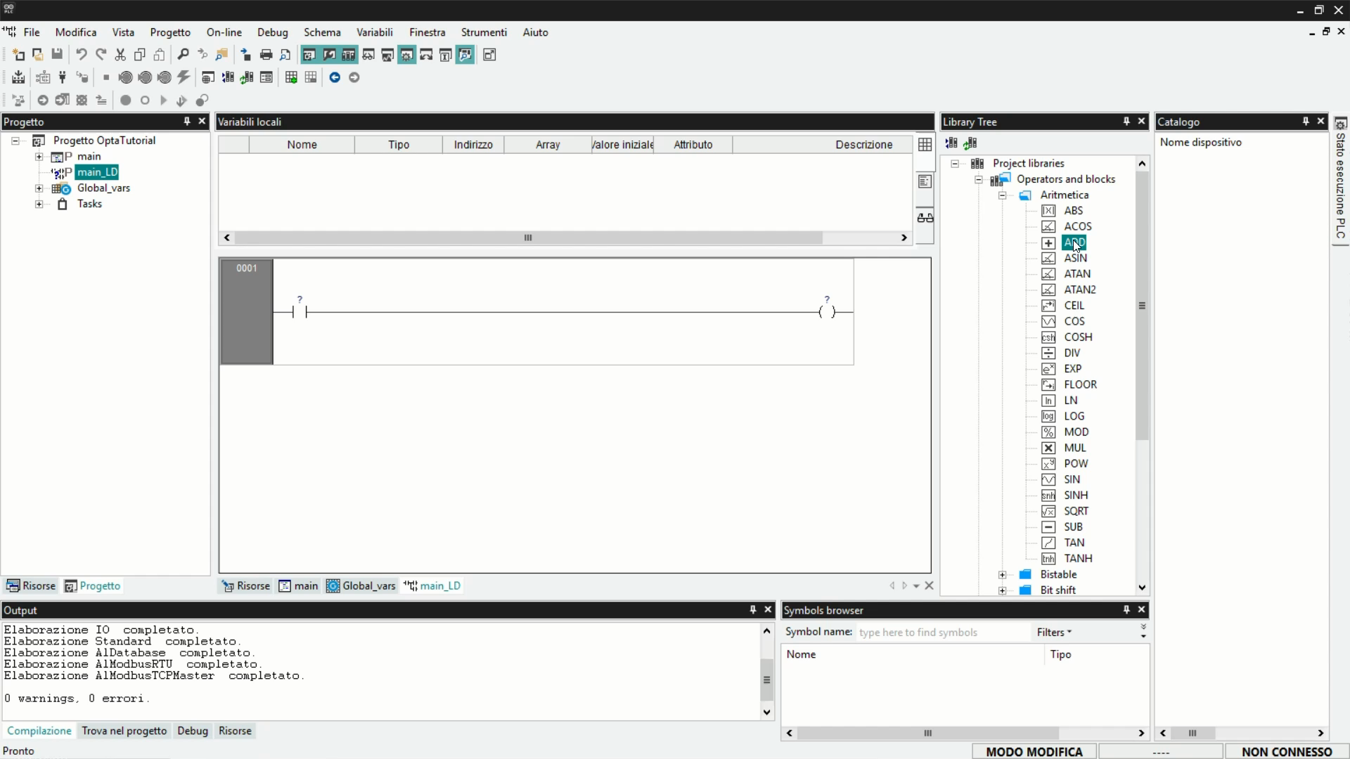 Questi blocchi possono essere utilizzati nei programmi scritti in linguaggi che supportano la logica a blocchi funzione, come Ladder Diagram (LD), Sequential Function Chart (SFC) e Function Block Diagram (FBD). In questo esempio, useremo Ladder Diagram (LD).